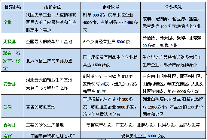 北京:地區(qū)以皮革為主要原料的規(guī)模以上企業(yè)超過40家,年工業(yè)總產(chǎn)值達57億元;雖然大紅門皮革城已經(jīng)搬出北京,但是將于2015年元旦在河北廊坊正式開業(yè),到北京南站僅17分鐘。
