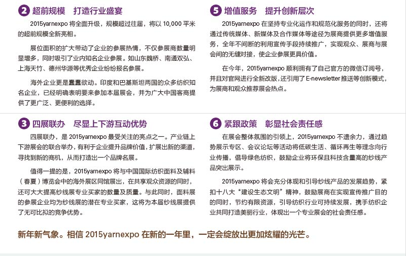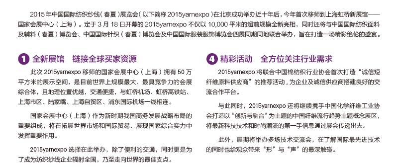 錦橋紡織網(wǎng)—資訊頻道> 展會新聞>正文 聚焦 2015 YARN EXPO 春夏紗線展六大看點(diǎn)