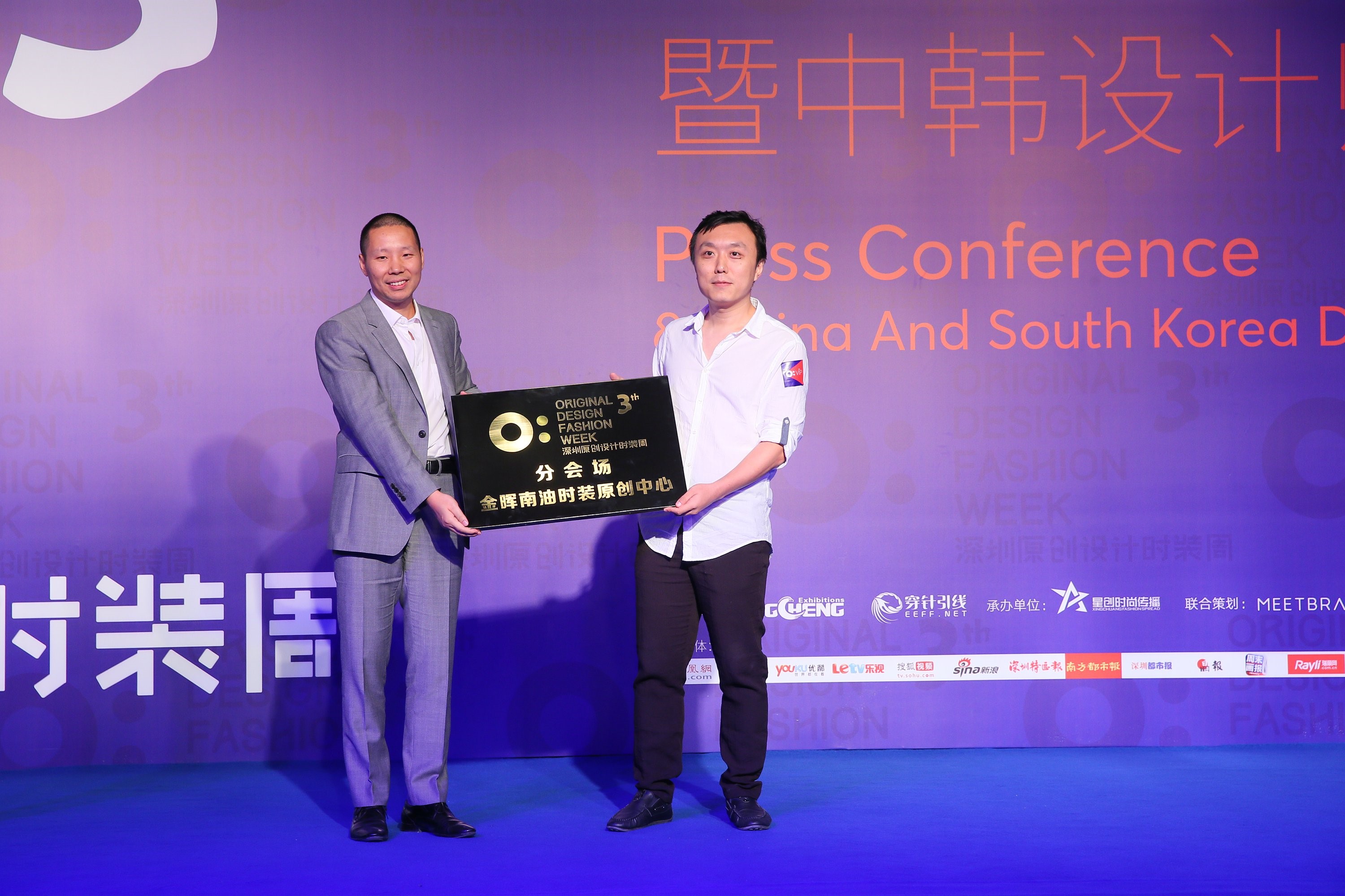 △深圳原創(chuàng)設計時裝周組委會秘書長楊春華先生與金暉南油時裝周原創(chuàng)中心總經理李丁先生進行時裝周南山分會場-金暉南油時裝原創(chuàng)中心授牌儀式