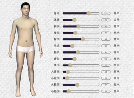 1.顧客可以看見1:1等高的3D虛擬的自己。量體師輸入顧客身材參數,即可生成3D虛擬形象,頭像和膚色也可通過照片獲得。如果與3D掃描儀相連,身材數據將自動導入。