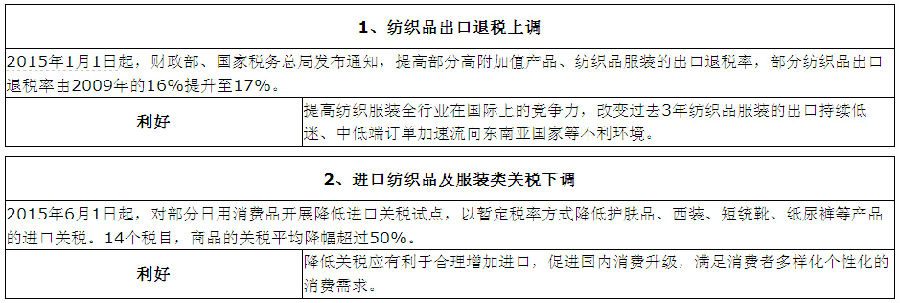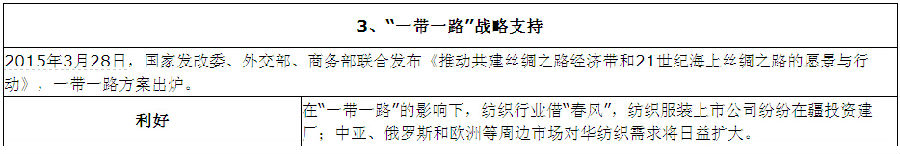 紡織品出口退稅上調(diào)以及進(jìn)口紡織品及服裝類關(guān)稅下調(diào),對(duì)于促進(jìn)外貿(mào)出口和刺激國(guó)內(nèi)消費(fèi),拉動(dòng)需求具有重要作用,再次成為提振紡織服裝行業(yè)的新信號(hào)和正能量,而“一帶一路”的戰(zhàn)略支持,也為企業(yè)拓展新的發(fā)展空間指明了方向。