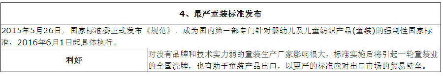 對(duì)此,2015年國(guó)家和地方積極推出了各項(xiàng)政策和標(biāo)準(zhǔn),一方面為紡織行業(yè)陣痛期轉(zhuǎn)型升級(jí)添磚加瓦,另一面在紡織業(yè)面臨深度調(diào)整背景下,各項(xiàng)嚴(yán)厲標(biāo)準(zhǔn)的出臺(tái)也不失為加速紡織行業(yè)清理洗牌的關(guān)鍵。