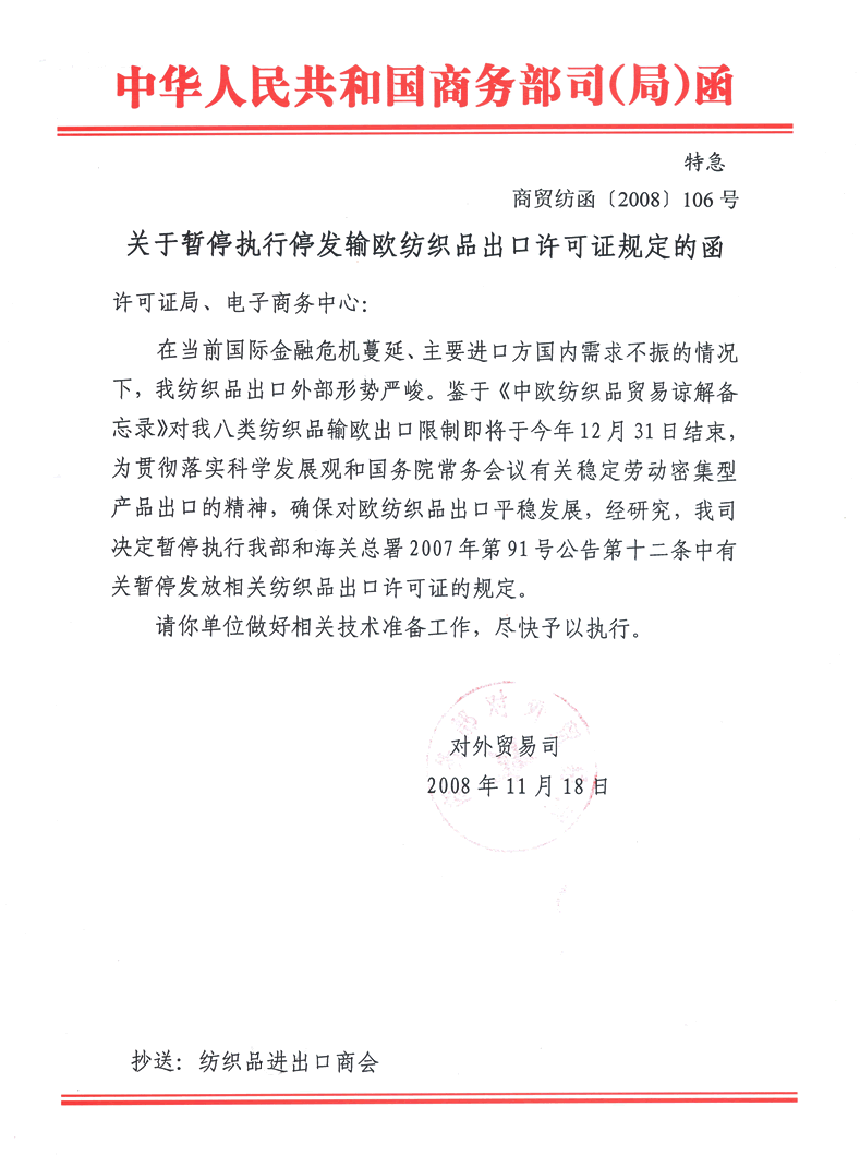 【發(fā)布單位】中華人民共和國商務(wù)部 【發(fā)布文號】公告2008年第91號 【發(fā)布日期】2008-11-14 【實施日期】2009-01-01 根據(jù)《中華人民共和國對外貿(mào)易法》,自2009年1月1日起,全部取消蠶繭和部分蠶絲產(chǎn)品(海關(guān)編碼5001-5003)的出口配額許可證管理,企業(yè)報關(guān)出口不再需要申領(lǐng)出口許可證。 特此公告。 中華人民共和國商務(wù)部 二