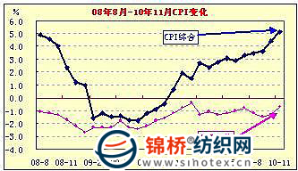 據(jù)國家統(tǒng)計局公布,2010年11月,我國居民消費價格同比上漲5.1%,為28個月來新高。其中食品價格上漲11.7%,非食品價格上漲1.9%;消費品價格上漲5.9%,服務項目價格上漲2.6%。分類別看,上漲幅度最大的分別為食品、居住和醫(yī)療保健,其中食品價格同比上漲11.7%,居住價格同比上漲5.8%,醫(yī)療保健及個人用品類價格同比上漲4.0%,煙酒及用品類價格同比上漲1.6%,家庭設備用品及維修服務價格同比上漲0.7%,娛樂教育文化用品及服務類價格同比上漲0.6%,衣著類價格和交通、通信類價格同比下降0.7%。1-11月份,居民消費價格同比上漲3.2%,比1-10月份擴大0.2個百分點。