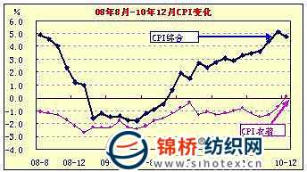2010年,居民消費價格同比上年上漲3.3%,其中12月份同比上漲4.8%。衣著類同比下降1個百分點,其中12月份同比增長0.1%。