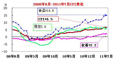 據(jù)國家統(tǒng)計(jì)局最新公布數(shù)據(jù)顯示,2011年7月份,全國居民消費(fèi)價(jià)格總水平同比上漲6.5%。創(chuàng)36個(gè)月來新高。其中,食品類價(jià)格同比上漲14.8%:糧食價(jià)格上漲12.4%,影響價(jià)格總水平上漲約0.34個(gè)百分點(diǎn);肉禽及其制品價(jià)格上漲33.6%,影響價(jià)格總水平上漲約2.08個(gè)百分點(diǎn)(豬肉價(jià)格上漲56.7%,影響價(jià)格總水平上漲約1.46個(gè)百分點(diǎn));蛋價(jià)格上漲19.7%,影響價(jià)格總水平上漲約0.15個(gè)百分點(diǎn);水產(chǎn)品價(jià)格上漲15.0%,影響價(jià)格總水平上漲約0.34個(gè)百分點(diǎn);鮮菜價(jià)格上漲7.6%,影響價(jià)格總水平上漲約0.19個(gè)百分點(diǎn);鮮果價(jià)格上漲4.9%,影響價(jià)格總水平上漲約0.09個(gè)百分點(diǎn)。 另外,煙酒類價(jià)格同比上漲2.8%。其中,煙草價(jià)格上漲0.3%,酒類價(jià)格上漲6.8%。衣著類價(jià)格同比上漲2.2%。其中,服裝價(jià)格上漲2.5%,鞋價(jià)格上漲0.6%。家庭設(shè)備用品及維修服務(wù)類價(jià)格同比上漲2.7%。其中,耐用消費(fèi)品價(jià)格上漲0.6%,家庭服務(wù)及加工維修服務(wù)價(jià)格上漲11.7%。醫(yī)療保健和個(gè)人用品類價(jià)格同比上漲3.6%。其中,西藥價(jià)格下降0.4%,中藥材及中成藥價(jià)格上漲13.7%,醫(yī)療保健服務(wù)價(jià)格上漲0.5%。交通和通信類價(jià)格同比上漲0.9%。其中,交通工具價(jià)格下降1.0%,車用燃料及零配件價(jià)格上漲14.8%,車輛使用及維修價(jià)格上漲4.6%,城市間交通費(fèi)價(jià)格上漲2.5%,市區(qū)公共交通費(fèi)價(jià)格上漲2.4%;通信工具價(jià)格下降13.2%。娛樂教育文化用品及服務(wù)類價(jià)格同比上漲0.5%。其中,教育價(jià)格上漲1.6%,文娛費(fèi)價(jià)格上漲1.7%,旅游價(jià)格上漲3.8%,文娛用耐用消費(fèi)品及服務(wù)價(jià)格下降6.6%。居住類價(jià)格同比上漲5.9%。其中,水、電、燃料價(jià)格上漲4.4%,建房及裝修材料價(jià)格上漲5.5%,住房租金價(jià)格上漲4.0%。