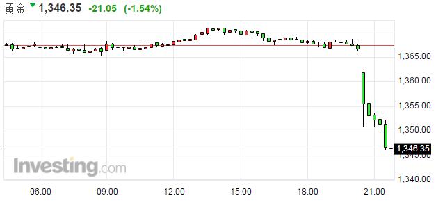 北京時間21:50,現(xiàn)貨黃金創(chuàng)一周新低,現(xiàn)報1346.35美元/盎司,跌幅1.54%。