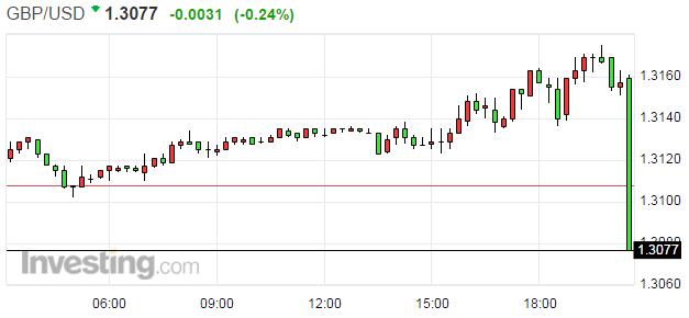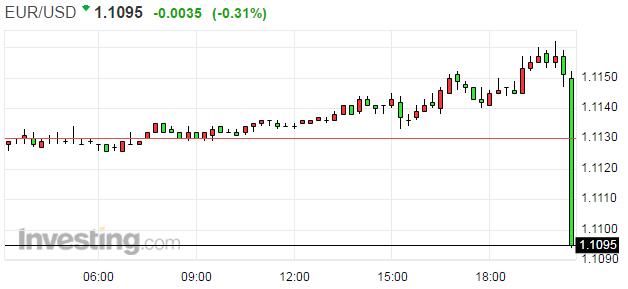數(shù)據公布后,美元指數(shù)暴漲,黃金大跌,國際油價短線下跌,歐元觸及歐元觸及1.11美元之下的日低,英鎊/美元跌至日低1.3082。