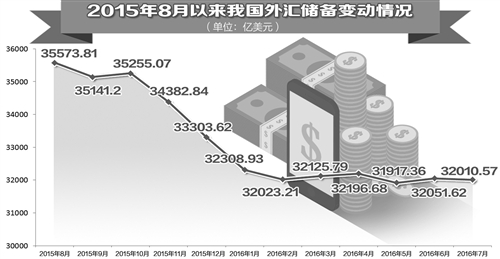 2015年7月,外匯儲(chǔ)備規(guī)模為36513.10萬億美元,至2016年7月,下降4502.53億美元。但外儲(chǔ)下降呈現(xiàn)明顯的階段性特征。去年三季度和四季度,外匯儲(chǔ)備總體上呈現(xiàn)下降趨勢(shì),除2015年10月出現(xiàn)單月上升之外,其他各月均有400億美元以上的下降。