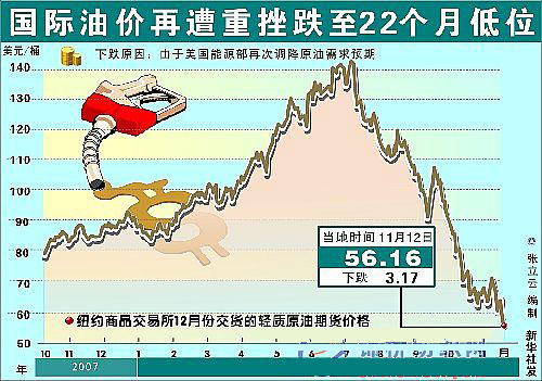 由于美國能源部再次調(diào)降原油需求預(yù)期,11月12日紐約、倫敦兩地油價(jià)雙雙暴跌5%以上,紐約市場(chǎng)油價(jià)創(chuàng)下22個(gè)月新低。 當(dāng)天紐約商品交易所12月份交貨的輕質(zhì)原油期貨價(jià)格下跌3.17美元,收于每桶56.16美元,是自2007年1月以來最低收盤價(jià)。倫敦國際石油交易所12月份交貨的北海布倫特原油期貨價(jià)格下跌3.34美元,收于每桶52.37美元。