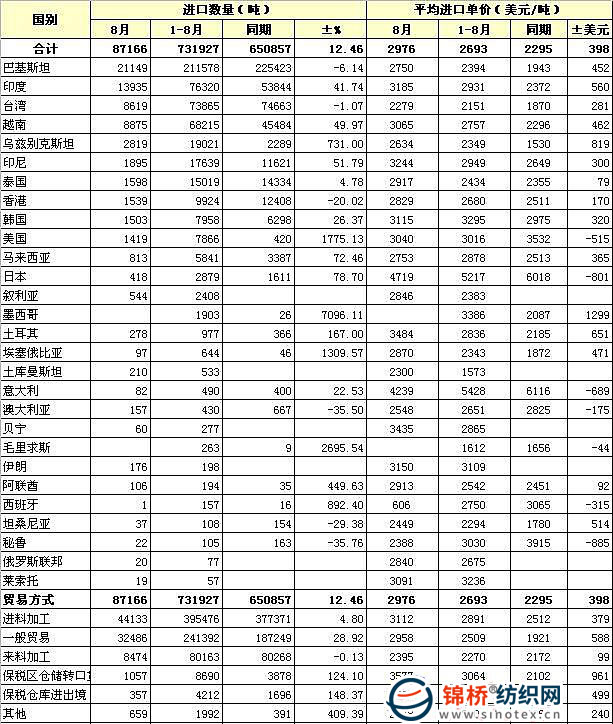 錦橋紡織網(wǎng)—資訊頻道> 統(tǒng)計(jì)資料>正文 2010年1-8月我國棉紗線進(jìn)口貿(mào)易方式及主要來源國別統(tǒng)計(jì)<< 2010年1-7月紡織工業(yè)主要產(chǎn)品產(chǎn)量(綜合)統(tǒng)計(jì)表2010年1-8月我國棉紗線出口貿(mào)易方式及主要國別統(tǒng)計(jì) >>