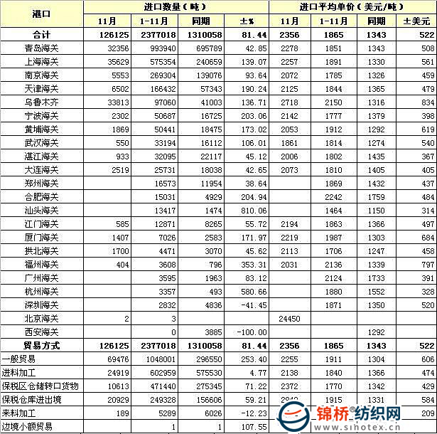錦橋紡織網(wǎng)—資訊頻道> 統(tǒng)計(jì)資料>正文 2010年1-11月各港口棉花進(jìn)口及貿(mào)易方式統(tǒng)計(jì)表