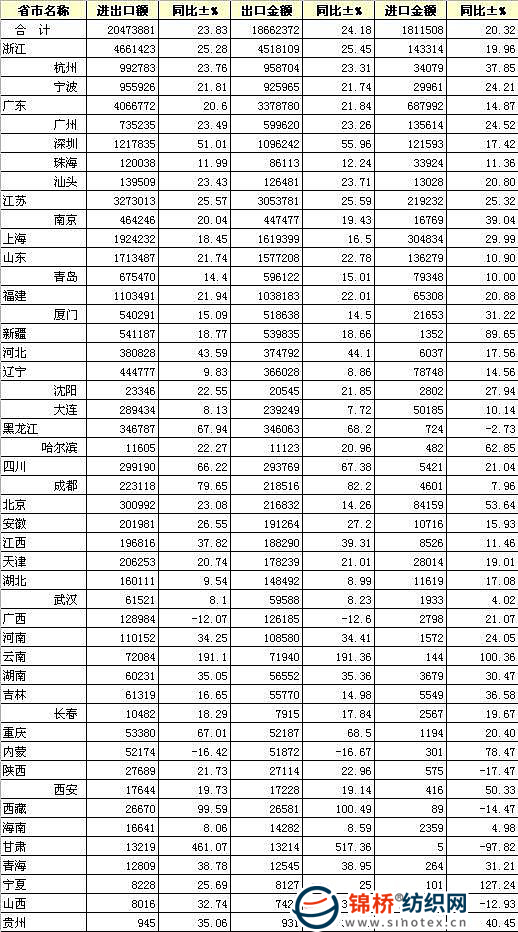 錦橋紡織網(wǎng)—資訊頻道> 統(tǒng)計(jì)資料>正文 2010年1-11月全國紡織服裝進(jìn)出口分省市統(tǒng)計(jì)