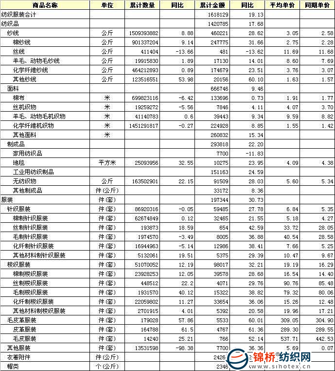 2010年1-10月全國紡織服裝出口產(chǎn)品統(tǒng)計(jì)