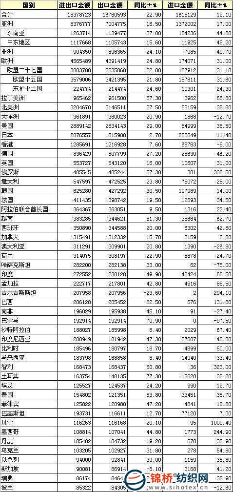 2010年1-10月我國(guó)紡織品服裝進(jìn)出口國(guó)別統(tǒng)計(jì)