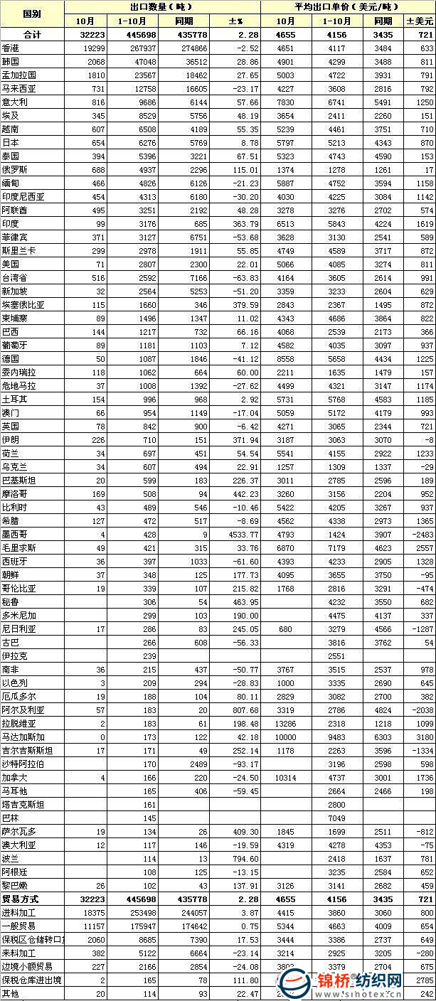 錦橋紡織網(wǎng)—資訊頻道> 統(tǒng)計資料>正文 2010年1-10月我國棉紗線出口貿(mào)易方式及主要國別統(tǒng)計