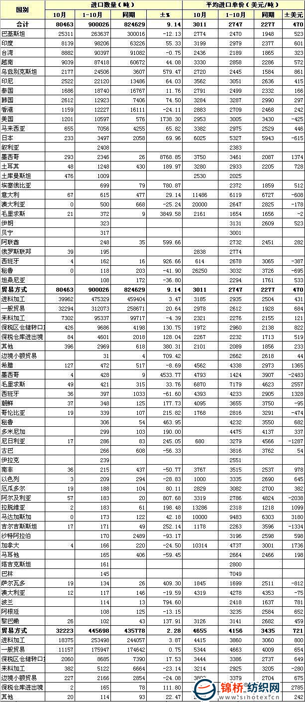 錦橋紡織網(wǎng)—資訊頻道> 統(tǒng)計資料>正文 2010年1-10月我國棉紗線進口貿(mào)易方式及主要來源國別統(tǒng)計