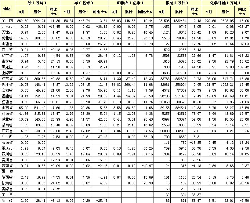 錦橋紡織網(wǎng)—資訊頻道> 統(tǒng)計(jì)資料>正文 2011年1-9月各省市主要產(chǎn)品產(chǎn)量統(tǒng)計(jì)表