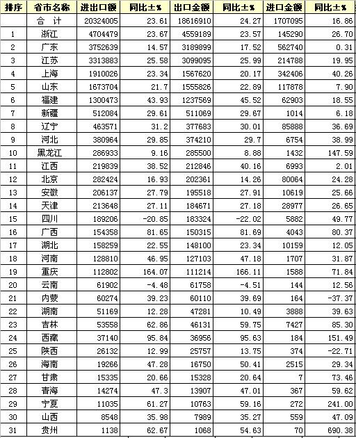 2011年1-9月全國紡織服裝進(jìn)出口分省市統(tǒng)計