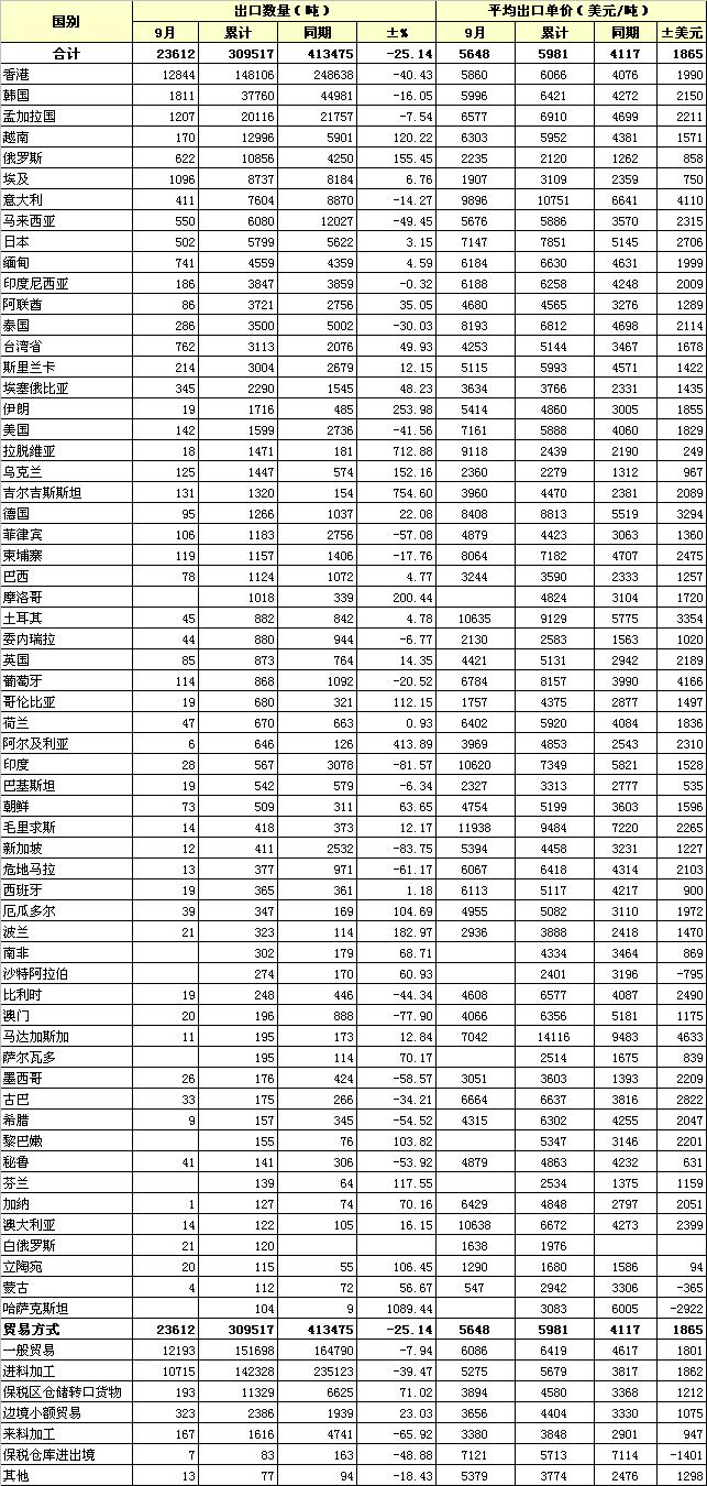 2011年9月我國(guó)棉紗線出口貿(mào)易方式及主要國(guó)別統(tǒng)計(jì)