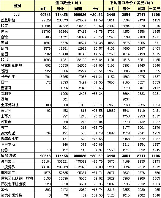 錦橋紡織網(wǎng)—資訊頻道> 統(tǒng)計資料>正文 2011年10月我國棉紗線進口貿(mào)易方式及主要來源國別統(tǒng)計