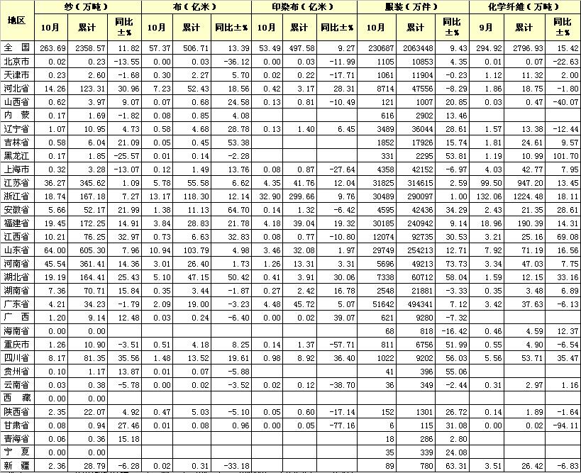 2011年10月紡織工業(yè)產量匯總表