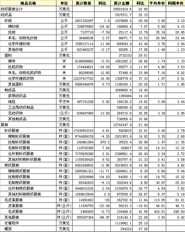 2011年1-10月全國(guó)紡織服裝出口產(chǎn)品統(tǒng)計(jì)