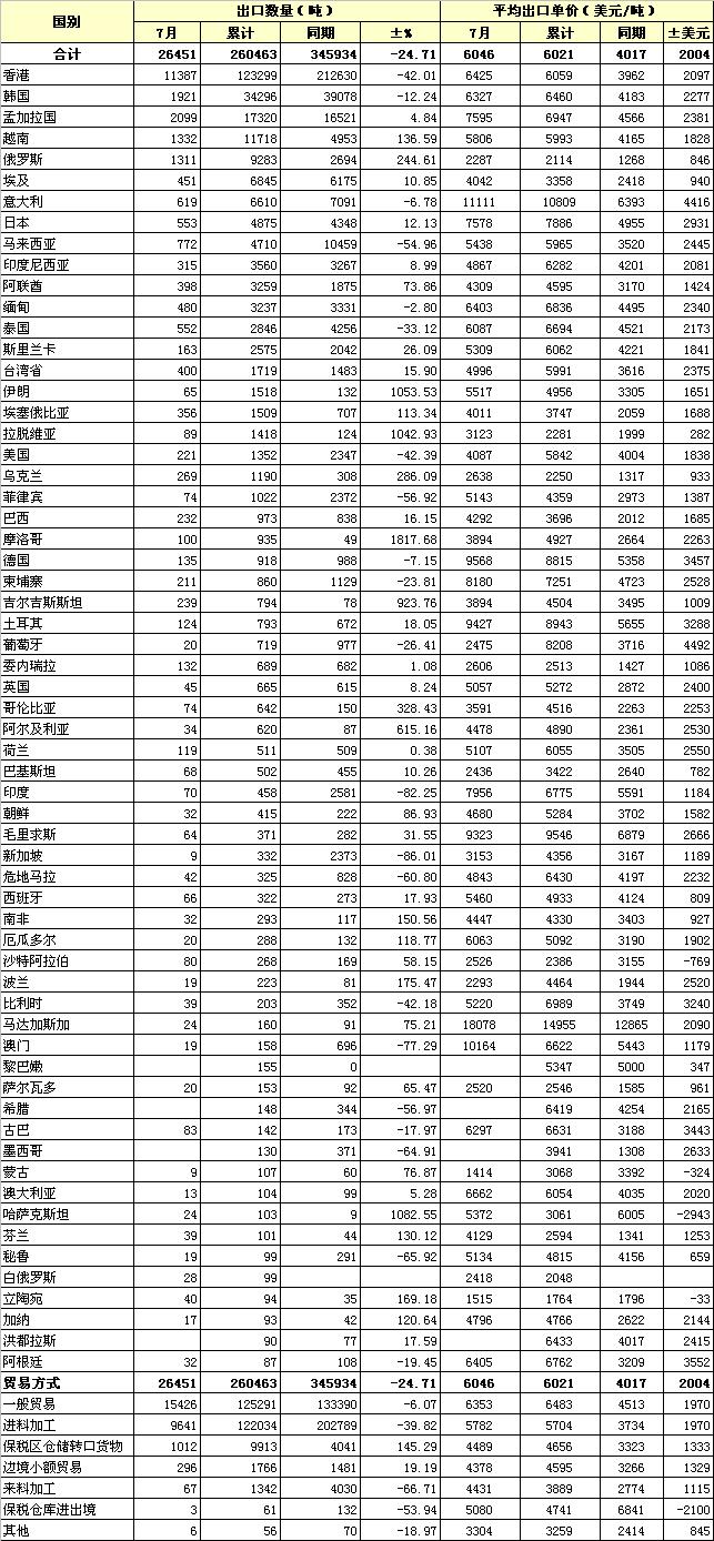 2011年7月我國棉紗線出口貿(mào)易方式及主要國別統(tǒng)計
