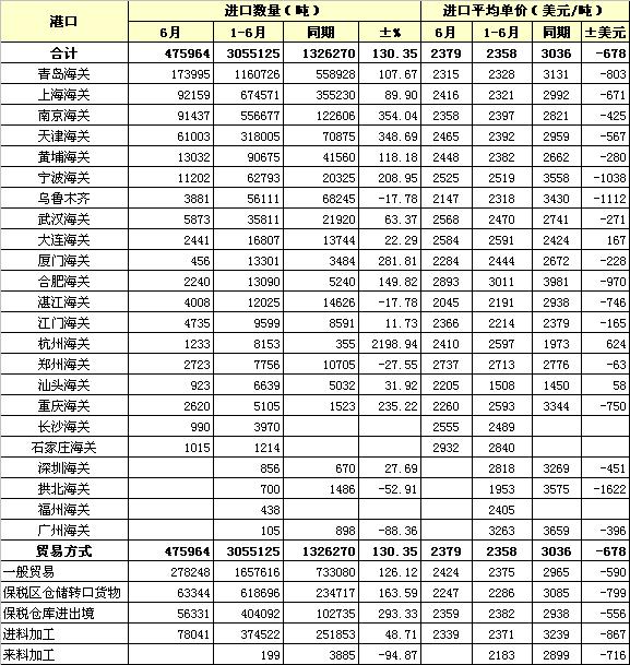 2012年6月各港口棉花進(jìn)口及貿(mào)易方式