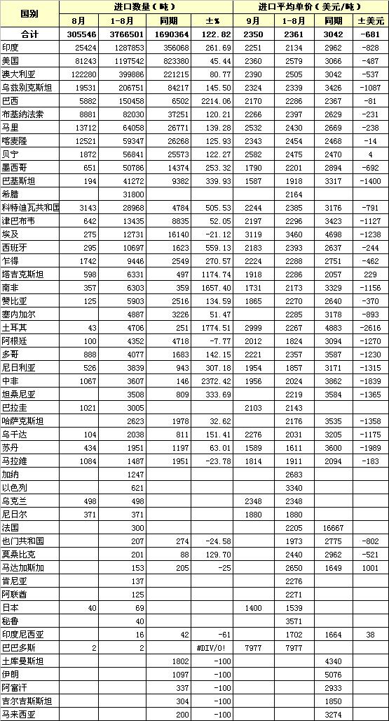 2012年8月棉花進(jìn)口主要來(lái)源地區(qū)