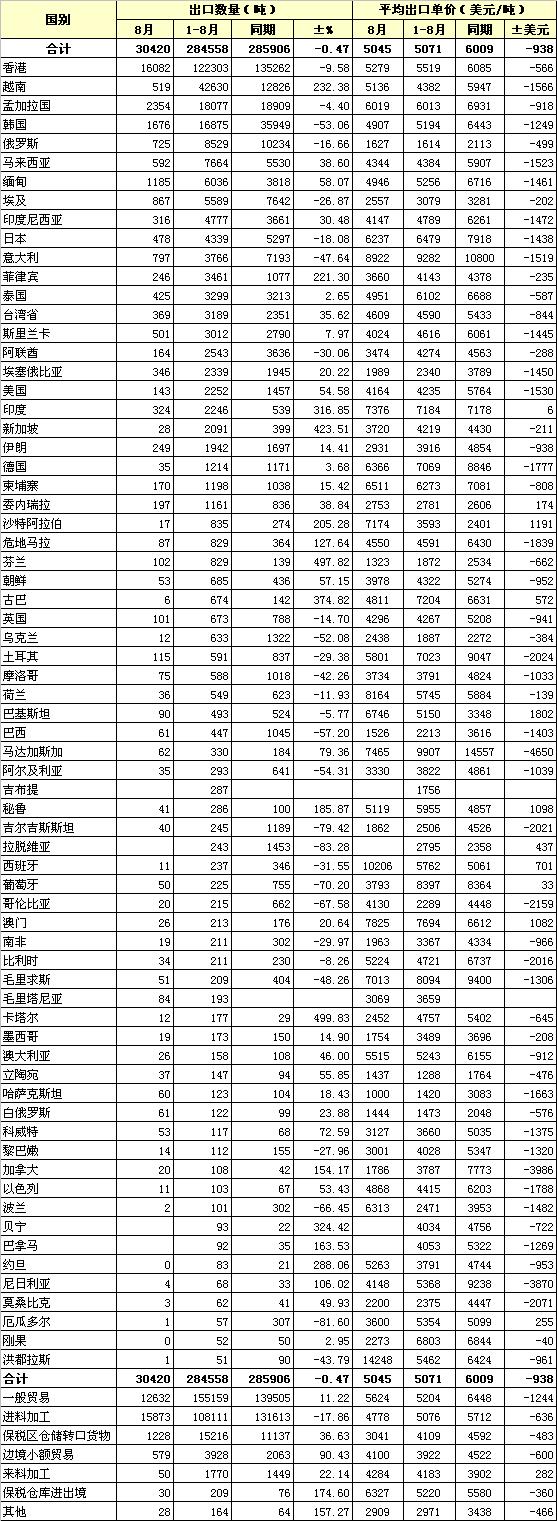 2012年8月我國棉紗線出口統(tǒng)計(jì)