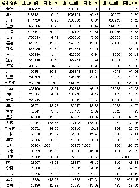 2012年10月全國紡織服裝進出口分省市統(tǒng)計