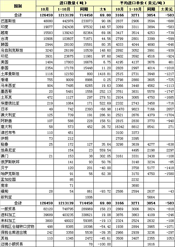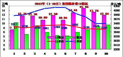 錦橋紡織網(wǎng)—資訊頻道> 統(tǒng)計(jì)資料>正文 2012年10月我國(guó)棉紗線進(jìn)口統(tǒng)計(jì)