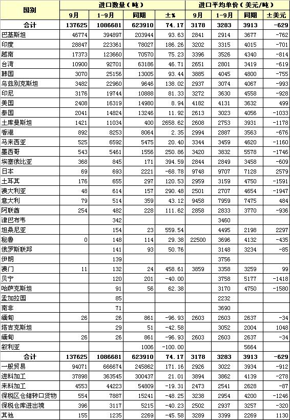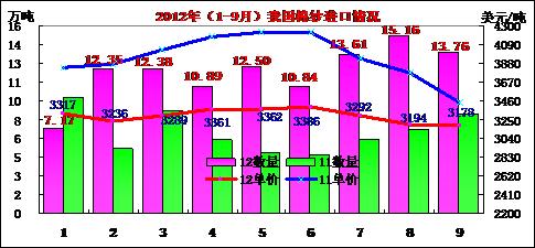 2012年9月我國棉紗線進(jìn)口統(tǒng)計(jì)
