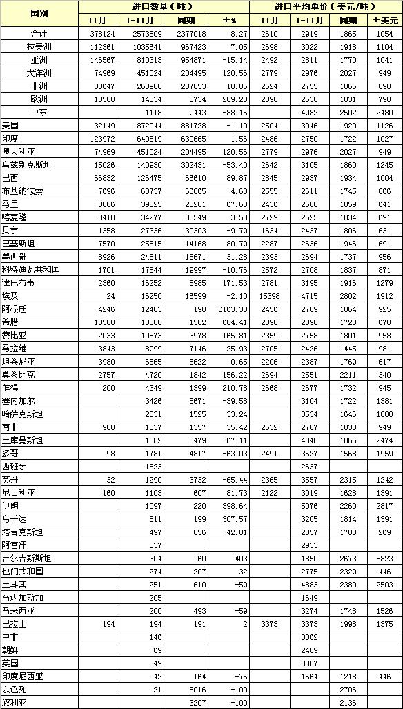 2011年11月棉花進(jìn)口主要來源地區(qū)及國(guó)別