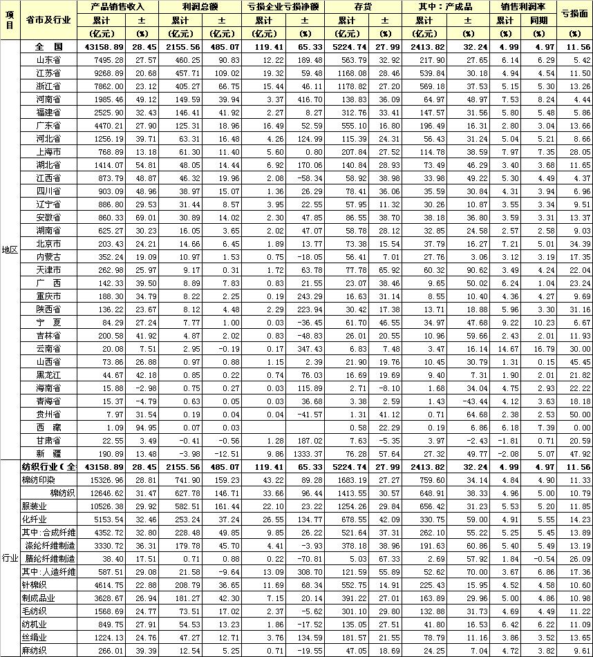 2011年1-10月紡織工業(yè)經濟指標完成情況匯總表