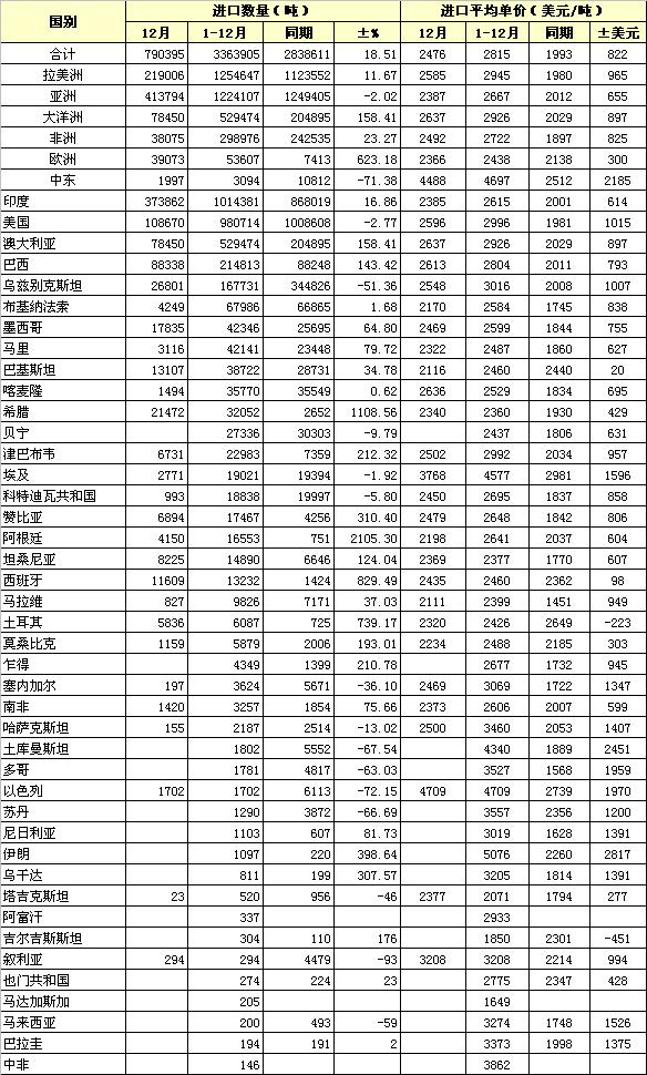 錦橋紡織網(wǎng)—資訊頻道> 統(tǒng)計(jì)資料>正文 2011年12月棉花進(jìn)口主要來源地區(qū)及國(guó)別