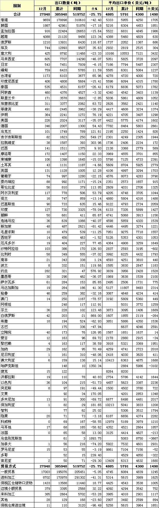 錦橋紡織網(wǎng)—資訊頻道> 統(tǒng)計(jì)資料>正文 2011年12月我國棉紗線出口貿(mào)易方式及主要國別統(tǒng)計(jì)