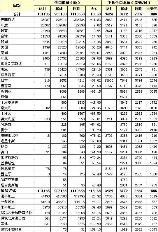 2011年12月我國(guó)棉紗線(xiàn)進(jìn)口貿(mào)易方式及主要來(lái)源國(guó)別統(tǒng)計(jì)