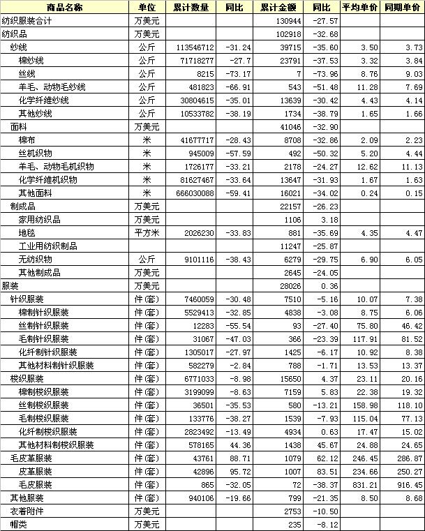 2012年1月全國紡織服裝進口產(chǎn)品統(tǒng)計
