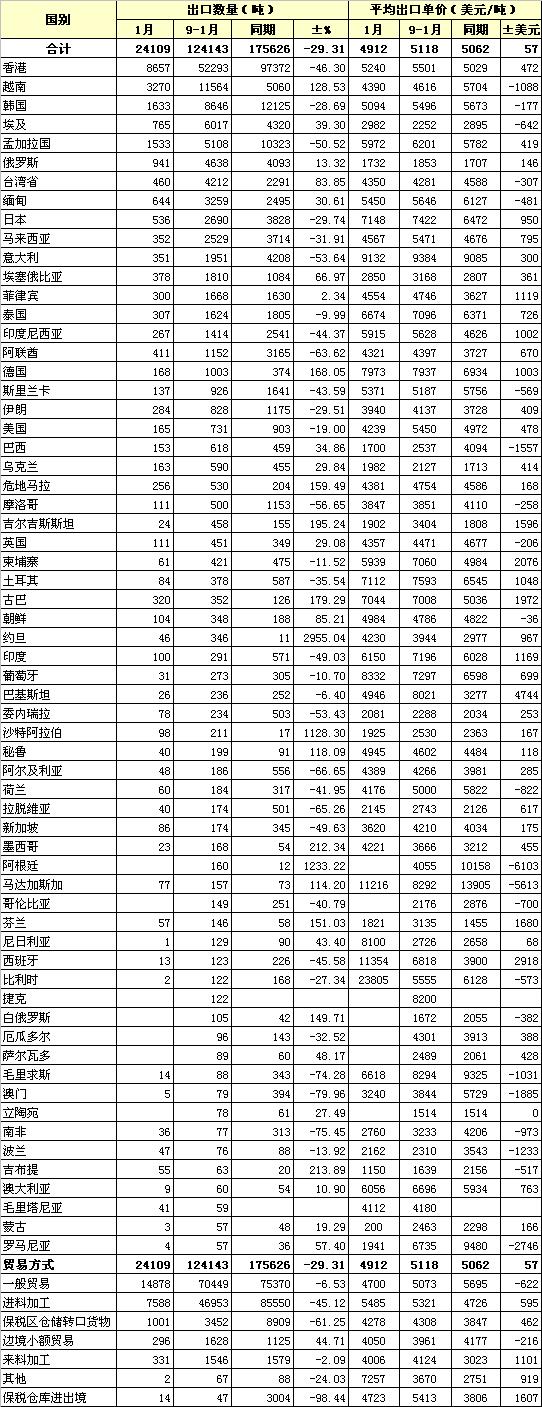 2012年1月我國棉紗線出口統(tǒng)計(jì)