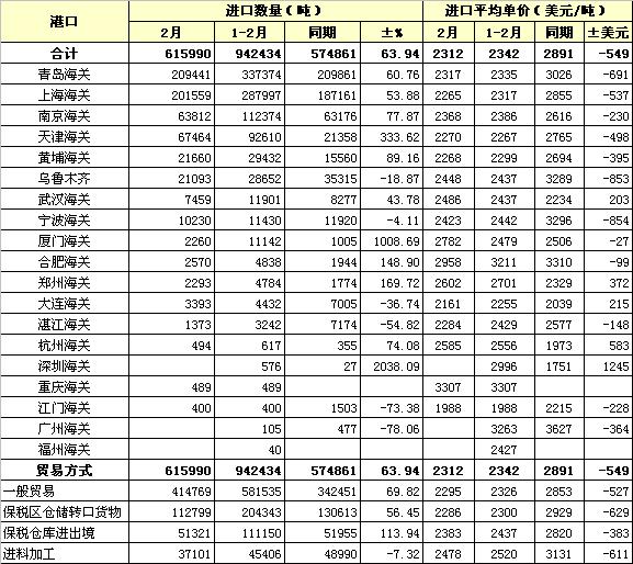 錦橋紡織網(wǎng)—資訊頻道> 統(tǒng)計資料>正文 2011年2月各港口棉花進口及貿(mào)易方式