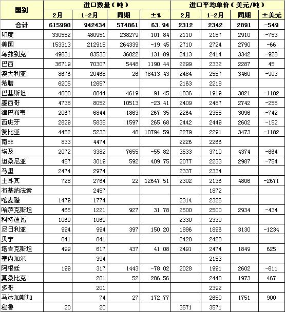 2011年2月棉花進口主要來源地區(qū)及國別