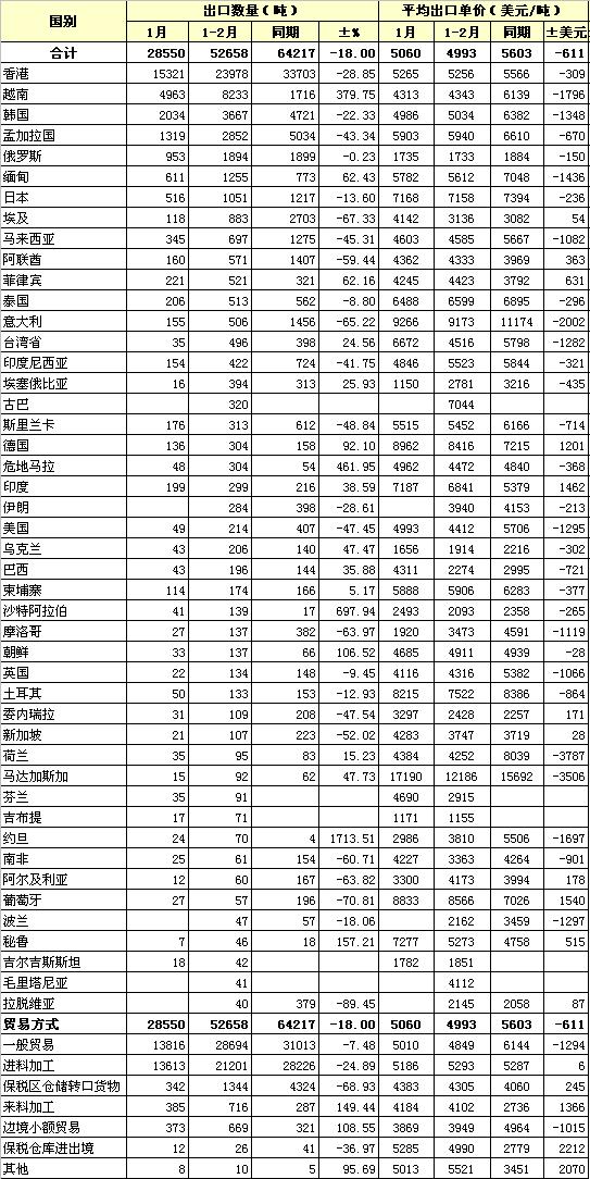 2012年2月我國棉紗線出口統(tǒng)計(jì)
