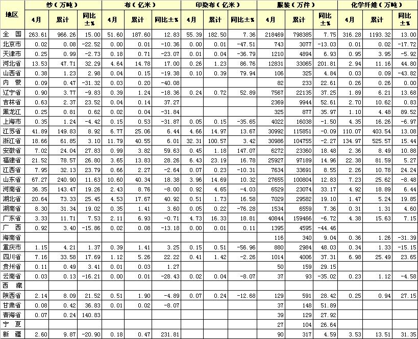 錦橋紡織網(wǎng)—資訊頻道> 統(tǒng)計資料>正文 2012年1-4月各省市主要產(chǎn)品產(chǎn)量統(tǒng)計