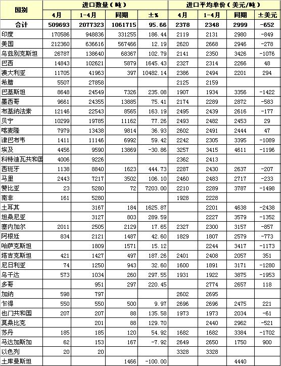 錦橋紡織網(wǎng)—資訊頻道> 統(tǒng)計(jì)資料>正文 2012年4月棉花進(jìn)口主要來源地區(qū)及國(guó)別