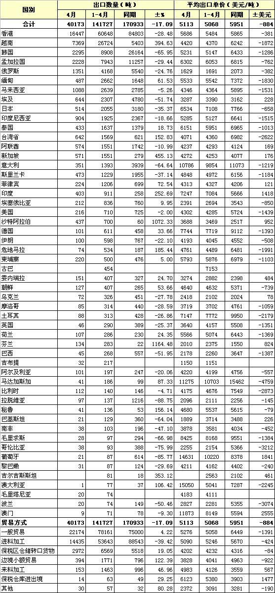 2012年4月我國棉紗線出口統(tǒng)計