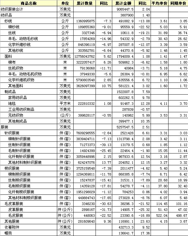 2012年5月全國(guó)紡織服裝出口產(chǎn)品統(tǒng)計(jì)