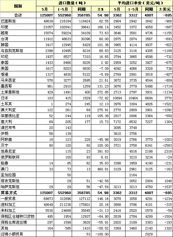 2012年5月我國棉紗線進(jìn)口統(tǒng)計