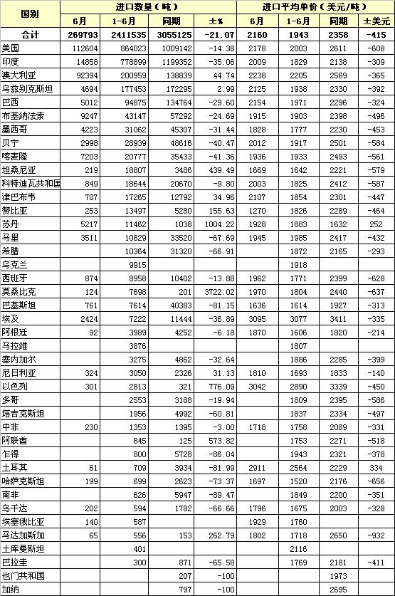 2013年6月棉花進(jìn)口國(guó)別統(tǒng)計(jì)